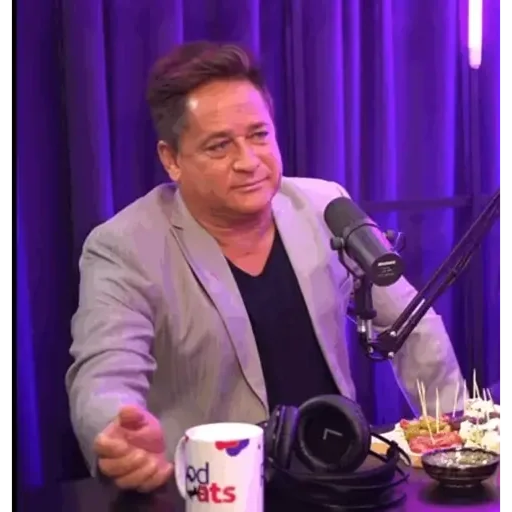 Homem mais velho com cabelo grisalho e expressão de surpresa ou indignação, vestindo um blazer azul.