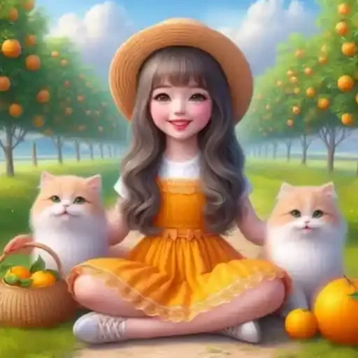 Menina sentada no chão com dois gatos laranjas ao lado, usando um chapéu e vestido laranja, em um pomar de laranjeiras.