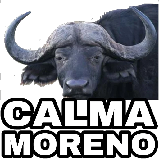 Um búfalo com chifres grandes e olhar sério, com o texto 'CALMA MORENO' em letras grandes abaixo.