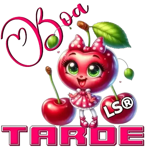 Uma menina fofa com uma cabeça de cereja, vestida com um tutú rosa e branco, rodeada de cerejas e uma folha verde, com o texto 'Oba' em rosa e 'TARDE' em rosa abaixo.
