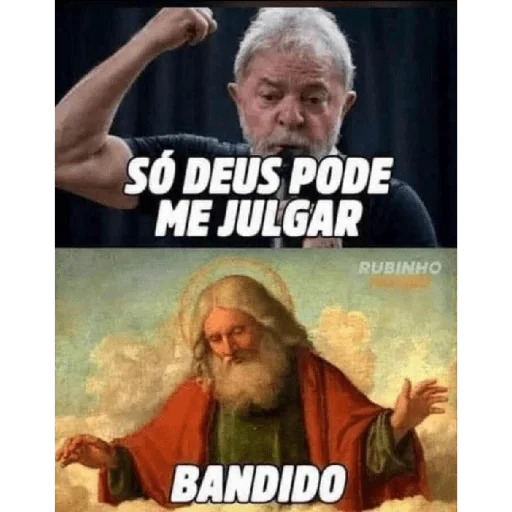Um meme com duas imagens. A primeira mostra um homem com o punho levantado e a frase 'SÓ DEUS PODE ME JULGAR'. A segunda imagem é de Deus com uma auréola, vestindo um manto vermelho e com as mãos abertas, com a palavra 'BANDIDO' abaixo.