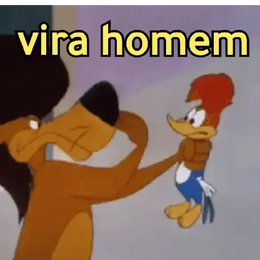 Um meme com Woody Woodpecker sendo segurado por outro personagem, com a frase 'vira homem' escrita em amarelo.