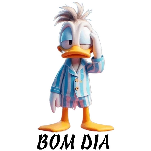 Um pato cartoon com expressão sonolenta e desajeitada, vestindo uma camisa de dormir listrada azul e rosa, com a mão na cabeça. Abaixo dele, está escrito 'BOM DIA'.