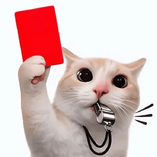 Um gato com expressão surpresa segura um cartão vermelho e um apito na boca.