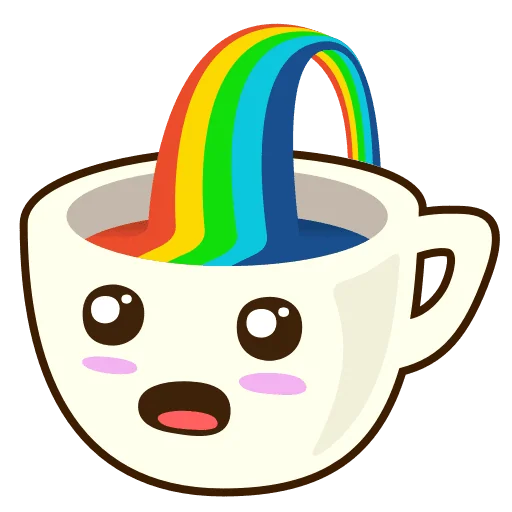 Xícara de café com arco-íris saindo de dentro, olhos arregalados e bochechas rosadas.