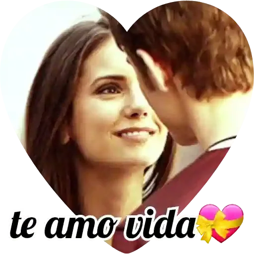 Um casal se beijando, com a mulher sorrindo e o homem com a cabeça inclinada. A imagem é um coração com o texto 'te amo vida' e emojis de coração.