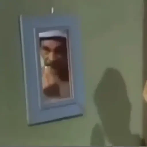 Um homem com um chapéu branco olha para fora de uma moldura cinza pendurada em uma parede verde, com a sombra de alguém ao lado.