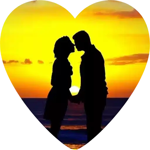 Um casal se beijando em silhueta contra um pôr do sol em forma de coração, com o céu laranja e amarelo ao fundo.