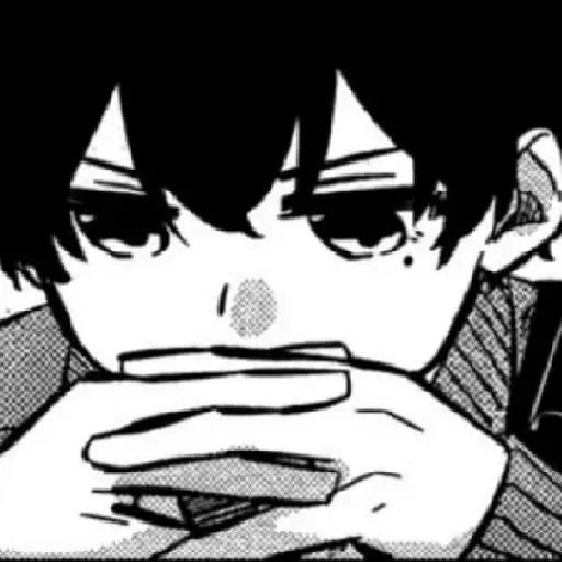 Personagem de anime com expressão séria e mão na frente da boca, parecendo pensativo ou surpreso.