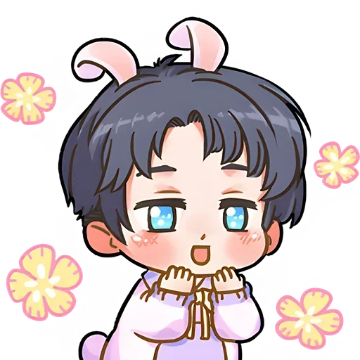 Menino de cabelo preto com orelhas de coelho e olhos azuis, vestindo uma roupa roxa e branca, com flores amarelas e rosadas ao redor.