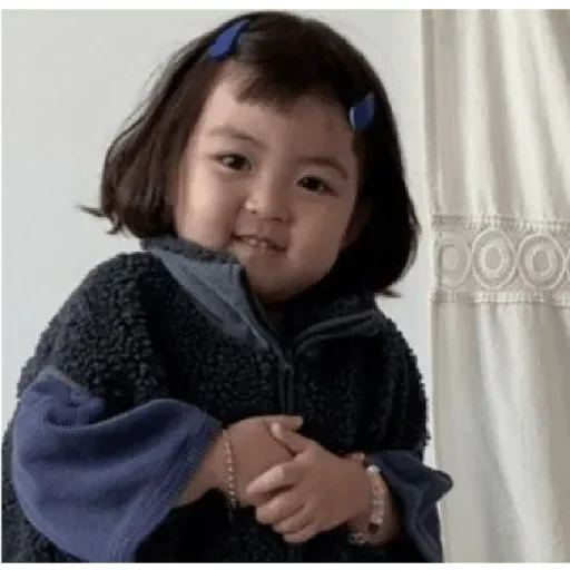 Menina com cabelo curto e dois clips azuis, vestindo um casaco preto com manga azul, com as mãos cruzadas e uma expressão facial cética ou confusa.