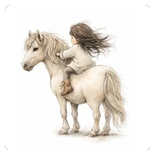Uma menina com cabelo castanho longo montada em um cavalo branco, com as pernas cruzadas e o cabelo ao vento.