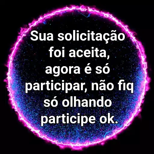 Um círculo com borda rosa e azul neon contém o texto 'Sua solicitação foi aceita, agora é só participar, não fiqué só olhando participe ok.'