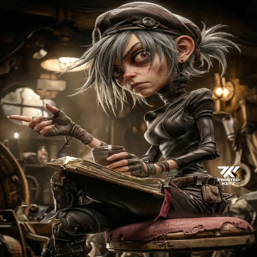 Uma mulher com cabelo cinza e um chapéu está sentada, olhando para baixo enquanto segura um objeto em sua mão esquerda. Ela parece estar em um ambiente escuro e industrial.