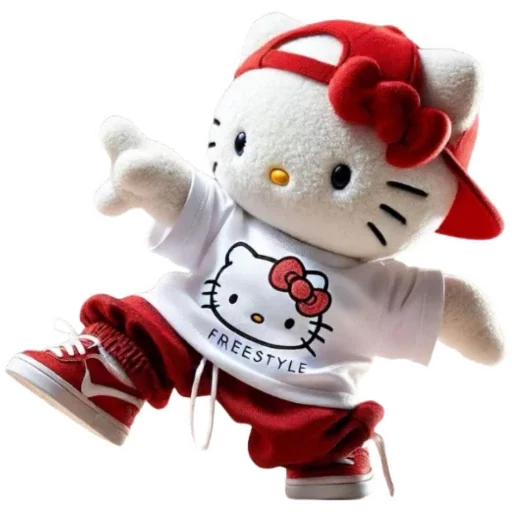 Hello Kitty vestida com roupas de skatista, usando um boné vermelho, óculos de sol não visíveis, camiseta branca com o logo da Hello Kitty e calças vermelhas.