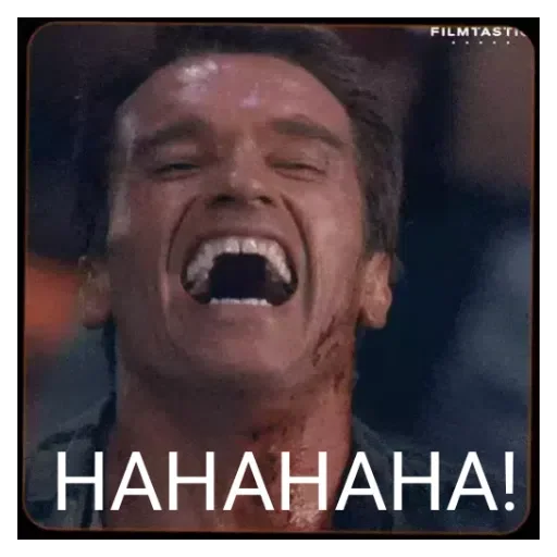 Homem com a boca aberta e olhos fechados, gritando de riso. Ele tem um texto 'HAHAHAHA!' embaixo.