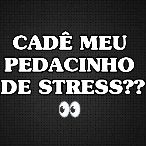 Um texto em branco sobre fundo preto que diz 'CADÊ MEU PEDACINHO DE STRESS??' com dois olhos no final.