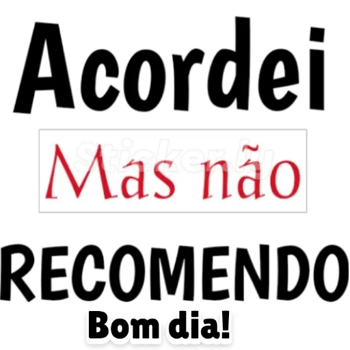 Uma figurinha com texto em preto e vermelho. 'Acordei Mas não RECOMENDO Bom dia!'