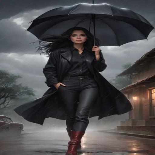 Mulher com cabelos pretos e longos, vestida com roupas pretas, incluindo um casaco, calças e botas, segura um guarda-chuva preto em uma rua molhada em meio a uma tempestade.