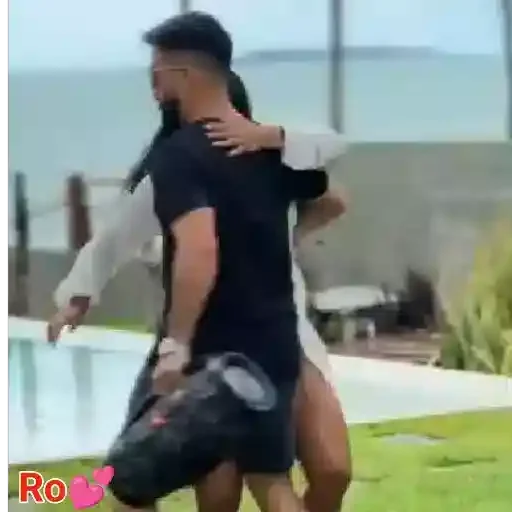 Um casal, com o homem de preto e a mulher de branco, se abraçando ao ar livre perto de uma piscina, com o homem carregando uma bolsa preta.
