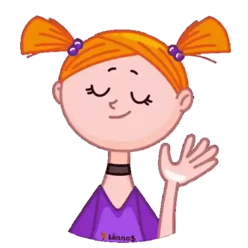 Menina de cabelos laranjas em coque duplo sorrindo e acenando com a mão direita, vestindo uma blusa roxa.