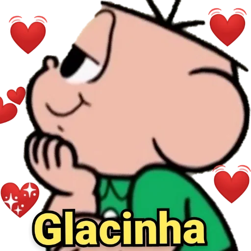 Menino de cabelo preto e camisa verde, com a mão no queixo e expressão pensativa, rodeado de corações vermelhos. A palavra 'Glacinha' está escrita em amarelo na parte inferior.