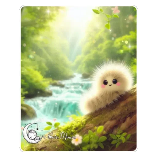 Um bichinho fofo com pelos brancos e olhos pretos sentado em uma pedra à beira de um riacho em um ambiente natural com vegetação e flores. O sol brilha ao fundo.