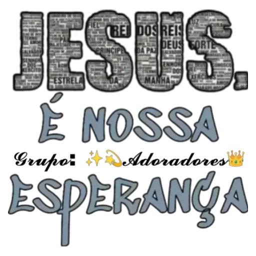 Uma figurinha com o texto 'JESUS É NOSSA ESPERANÇA' em letras grandes e coloridas, com o subtítulo 'Grupo: Adoradores' e emojis de estrelas e coroas.