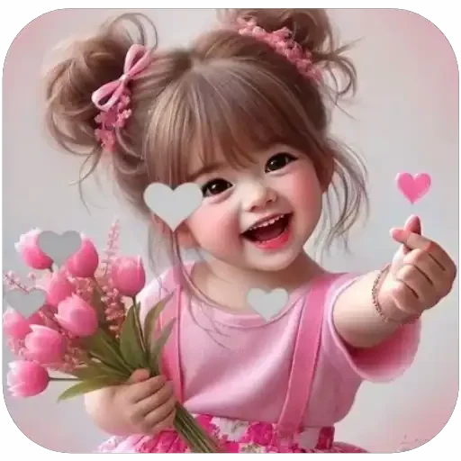 Menina com cabelo castanho e laços cor-de-rosa sorri e segura um buquê de flores cor-de-rosa e um coração. Ela tem um coração branco sobre o olho esquerdo e outro cinza no peito.