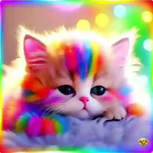 Gatinho fofo com listras coloridas na testa e pelagem, deitado em uma superfície fofa com fundo de luzes coloridas.