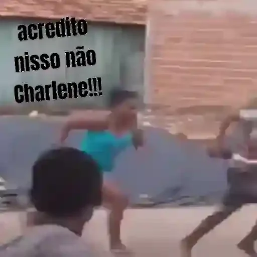 Cena de pessoas correndo em uma rua, com uma mulher de blusa azul e calções, e um homem ao fundo. Legenda: 'acredito nisso não Charlene!!!'
