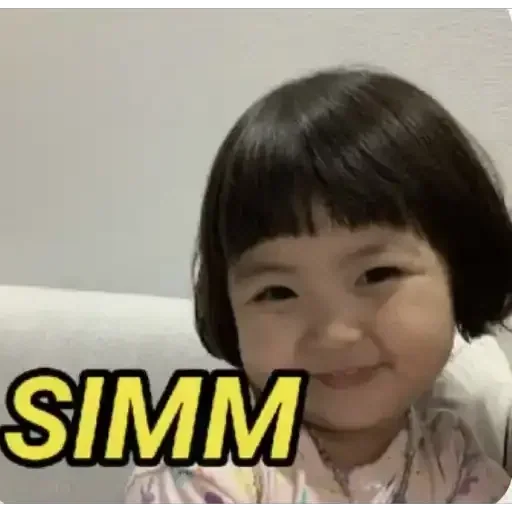 Menina com franja e cabelo preto olhando para frente com um sorriso leve, com o texto 'SIMM' em amarelo com contorno preto no canto inferior esquerdo.