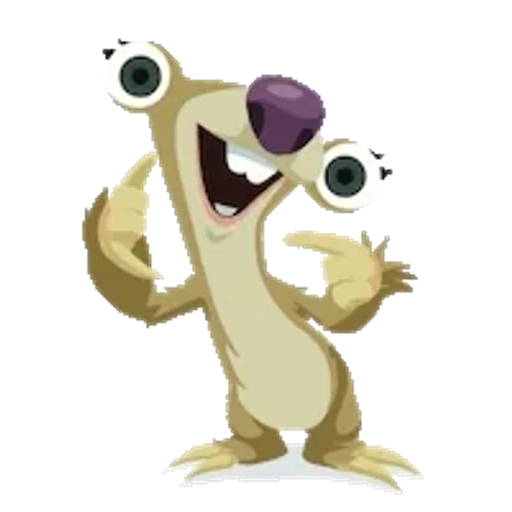 Um personagem de desenho animado, parecido com um furão ou esquilo, com olhos grandes e um nariz roxo, fazendo uma careta engraçada com a boca aberta e as mãos levantadas.