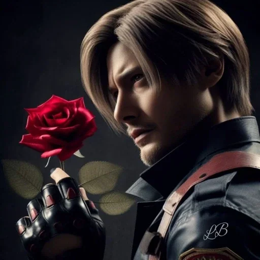 Um homem com cabelos castanhos e um olhar sério segura uma rosa vermelha na mão enluvada. Ele veste um traje preto com uma alça vermelha e um símbolo 'LB' no ombro.