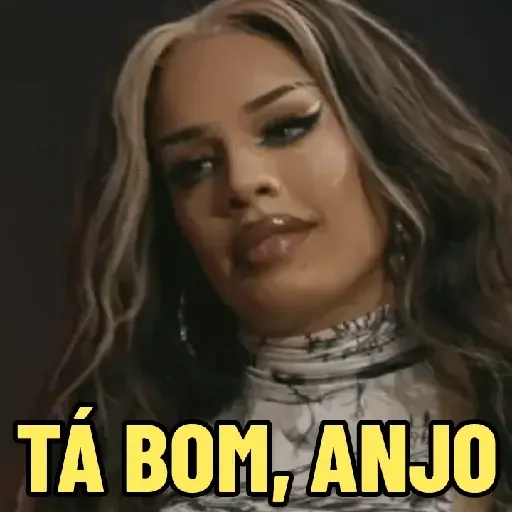 Imagem de uma mulher com cabelo castanho-claro e olhos escuros, vestindo maquiagem pesada e um colar. Ela está com uma expressão facial séria e o texto 'TÁ BOM, ANJO' está escrito em amarelo na parte inferior.