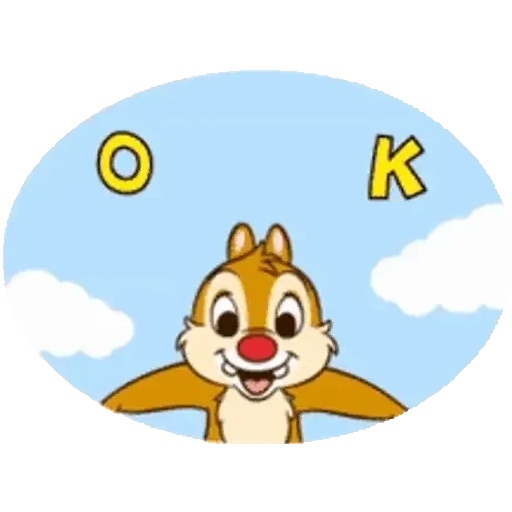Um esquilo cartoon com olhos grandes e nariz vermelho, sorrindo e com os braços abertos, contra um fundo azul com nuvens brancas e as letras 'O' e 'K' amarelas.