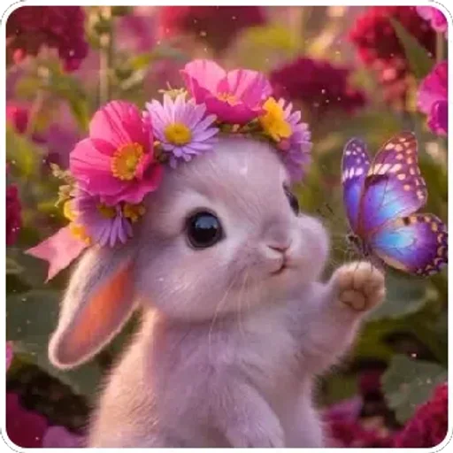Um coelho branco fofinho usando uma coroa de flores coloridas, com uma borboleta roxa brilhante ao lado, em um fundo de flores.