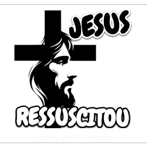 Silueta de Jesus Cristo com uma cruz ao fundo e o texto 'JESUS RESSUSCITOU' em preto e branco.