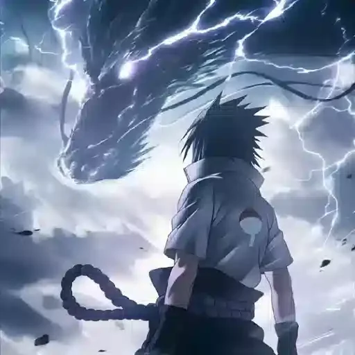 Personagem de anime com cabelo preto e vermelho, expressão séria, com raios azuis saindo de suas mãos.