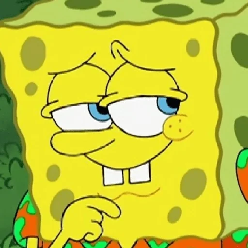 Esponja Bob com expressão cética, mão levantada e olhos azuis, fundo verde com manchas marrons.