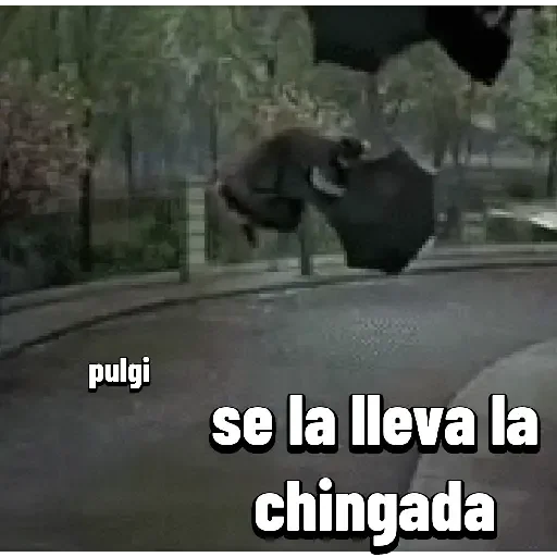Um homem pulando em uma rua com a frase 'se la lleva la chingada' em texto branco na parte inferior. O fundo mostra árvores e um banco.