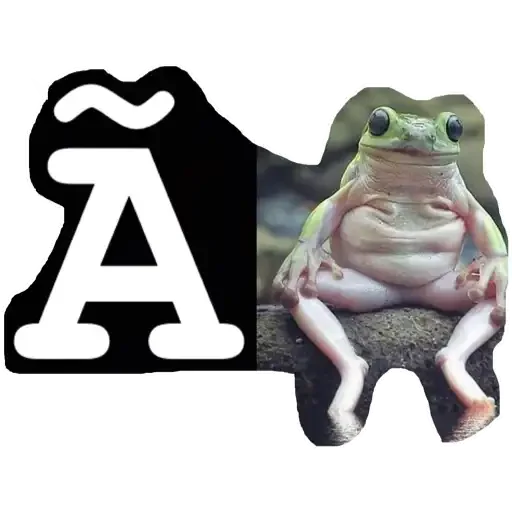 Um sapo verde e branco sentado com uma letra 'A' preta ao lado, com bigode.
