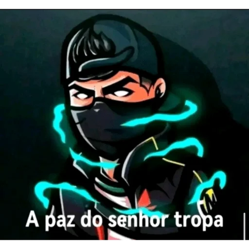 Um personagem de anime com máscara preta e capuz, com linhas azuis brilhantes ao redor do rosto e ombro. Ele diz 'A paz do senhor tropa'.