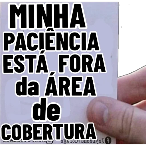 Uma mão segura um papel branco com o texto 'MINHA PACIÊNCIA ESTÁ FORA DA ÁREA DE COBERTURA' em letras pretas grandes.