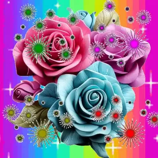 Três rosas coloridas, uma rosa azul, uma rosa pink e uma rosa magenta, com folhas e decorações brilhantes sobre um fundo arco-íris.