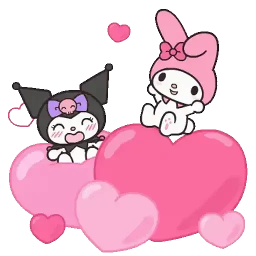 Dois personagens de desenho animado, um preto e um rosa, sentados em um coração rosa gigante, com corações menores ao redor.