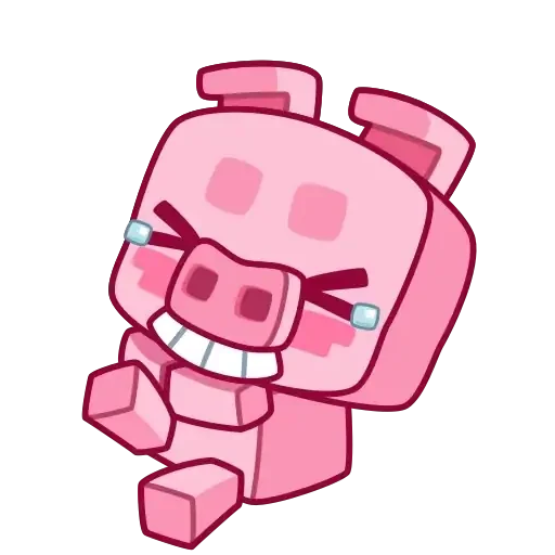 Um porco rosa de desenho animado com expressão feliz e olhos fechados, feito de blocos cúbicos.
