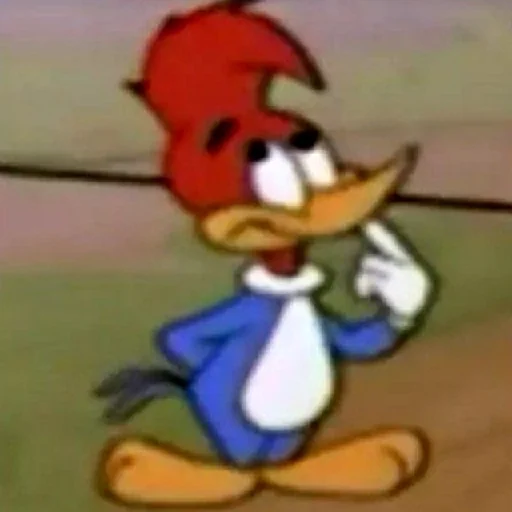 Um pica-pau cartoon com penas vermelhas e azuis, parecendo surpreso ou confuso, com uma expressão facial engraçada.