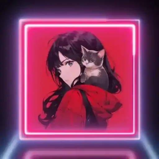 Uma mulher com cabelos pretos e um casaco vermelho olha para a esquerda enquanto um gato cinza olha para frente, ambos dentro de um quadrado rosa com contorno de neon.
