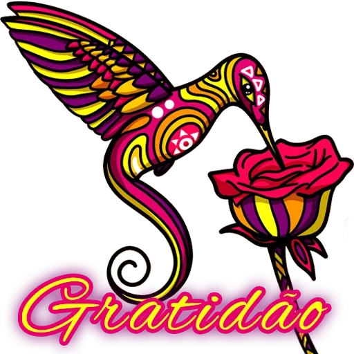 Um beija-flor colorido com padrões decorativos está prestes a beber néctar de uma rosa também colorida. Abaixo, a palavra 'Gratidão' em letras cursivas.